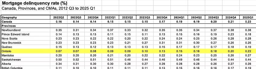 Ontario's mortgage delinquency rate it is as high as the Canadian average.